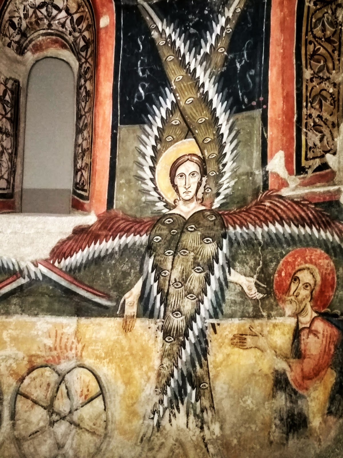 En la otra imagen, también se nos muestra un Serafín de una época anterior. Se trata de una pintura románica, del ábside de la iglesia de Santa María de Aneu perteneciente al Museo Nacional de Cataluña (Barcelona), S. XI y XII. En esta representación el artista (posiblemente el maestro Pedret), hace una diferencia en el color de dos de sus alas, las que son para volar tienen colores rojizos, mientras que las otras cuatro permanecen con los penetrantes ojos. También los tiene en las palmas de sus manos, siempre en alabanza.